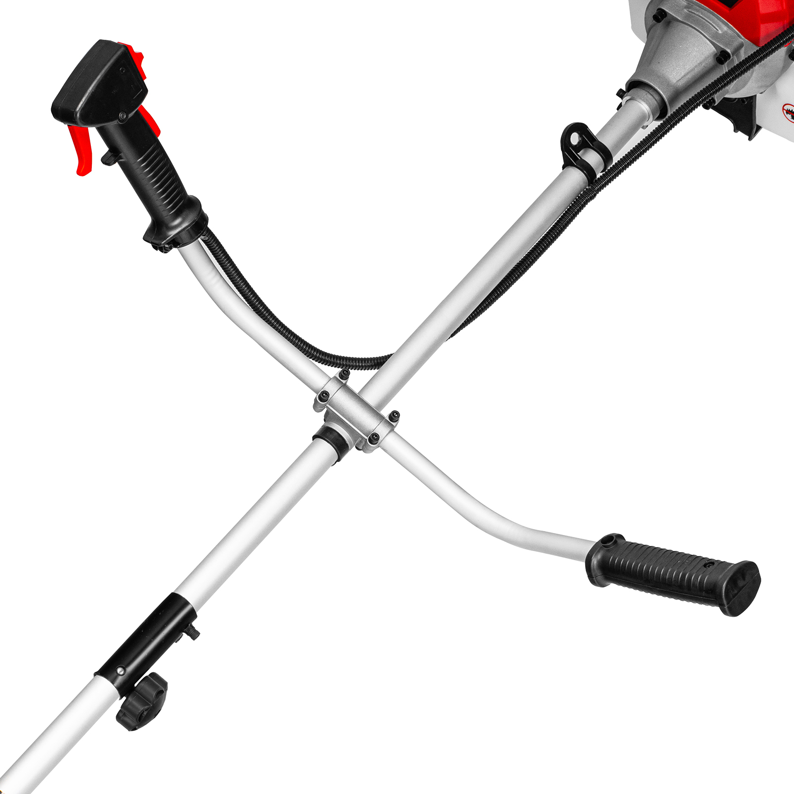 - Комфортная работа — благодаря плечевому ремню и рукояткам велосипедного типа триммер удобно удерживать и направлять.