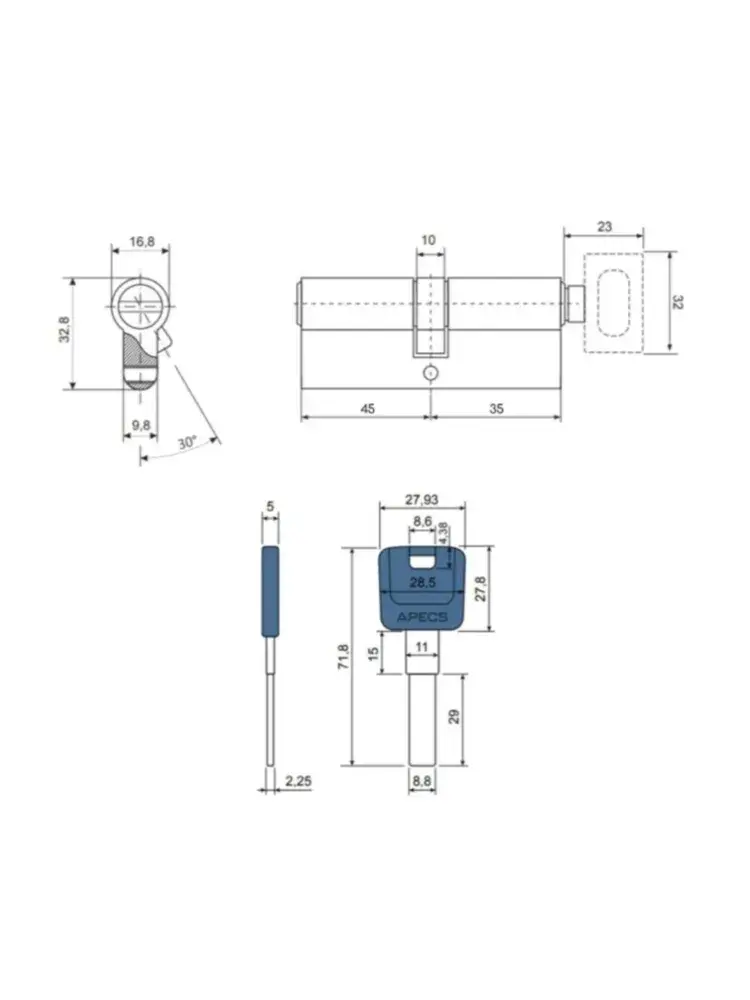 Механизмы секретности PM от Apecs – серия 7-ми пиновых цилиндров из ЦАМа с латунным сердечником и профильным латунным ключом с удобной пластиковой головкой. Apecs PM предназначены для комплектации замков под евроцилиндр. Рекомендуются для установки в межкомнатные и входные двери.