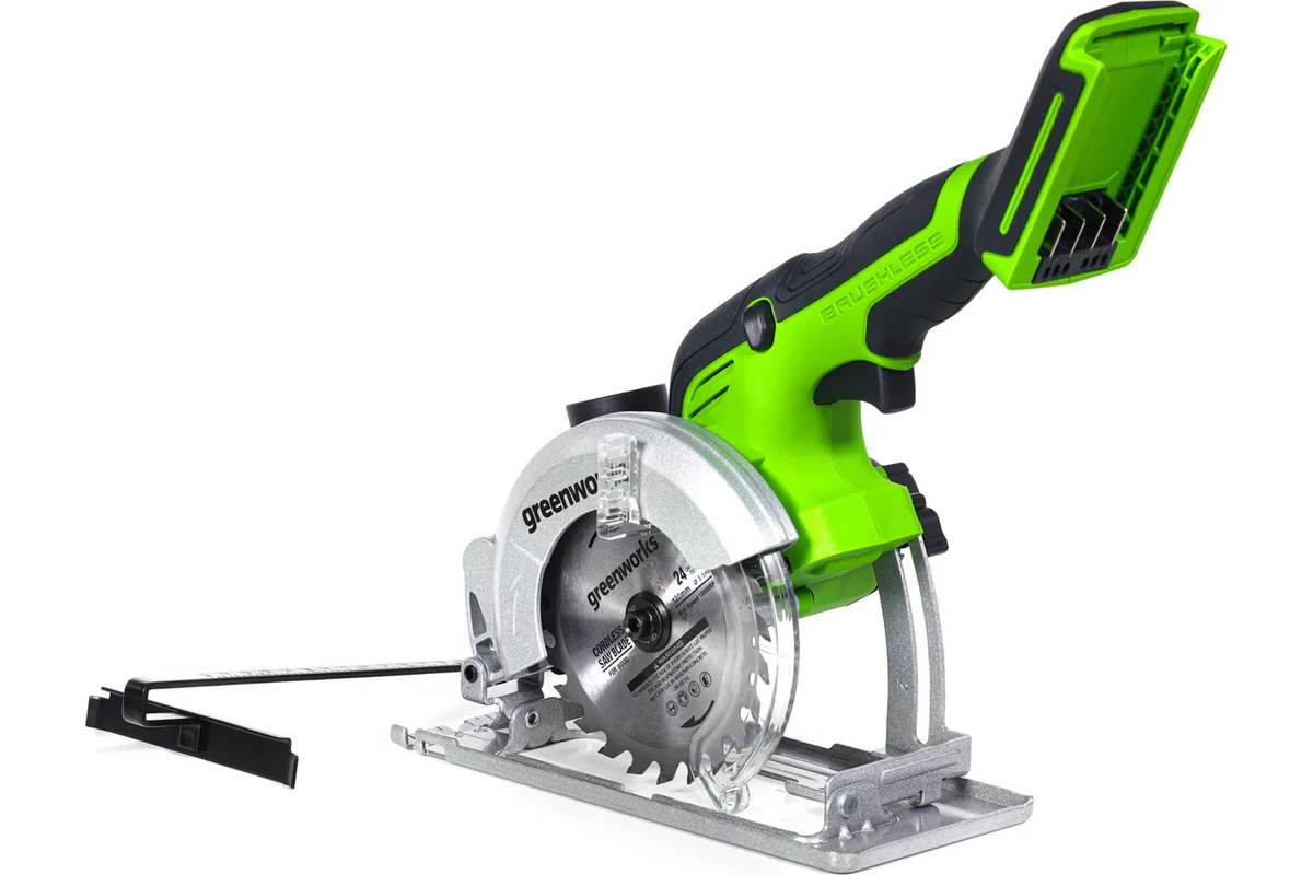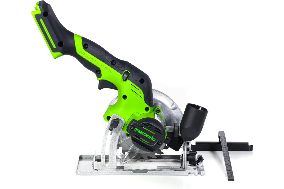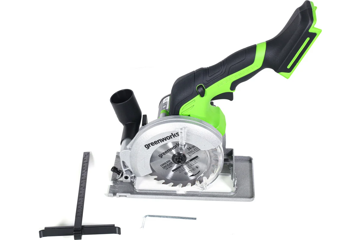 Компактная аккумуляторная дисковая мини пила Greenworks 1501207 (G24MCS) создана для выполнения отрезных работ листовых материалов, досок и брусков из древесины.