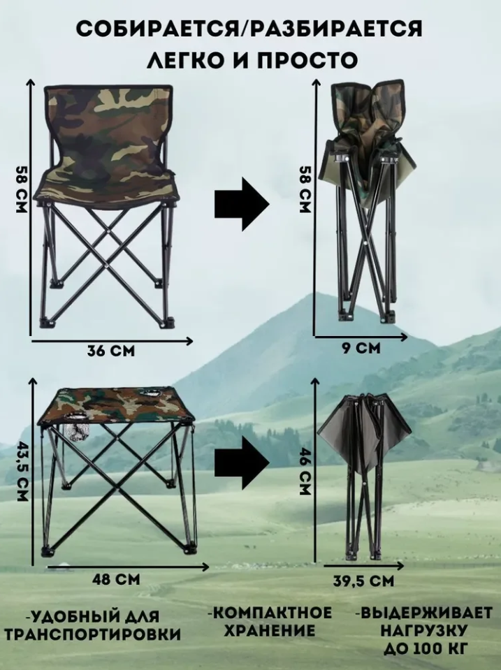 Набор складной мебели для отдыха на природе представляет собой надежное и удобное решение, разработанное с учетом комфорта и функциональности, чтобы обеспечить вам приятное времяпрепровождение на свежем воздухе. В комплект входит стол, четыре стула и чехол для удобной транспортировки и хранения. Весь набор складной мебели для кемпинга изготовлен из прочной и непромокаемой ткани. Вы можете быть уверены, что эта мебель прослужит вам долго и выдержит различные погодные условия, будь то солнечный день или небольшой дождь. Раскладной стол выдерживает до 20 кг и оснащен каркасом из легкого и прочного алюминиевого сплава. Изюминка нашего туристического стола это два сетчатых кармана для напитков. Четыре стула в наборе выдерживают до 90 кг каждый. Каркас изготовлен из стальных трубок, обеспечивая прочность.
