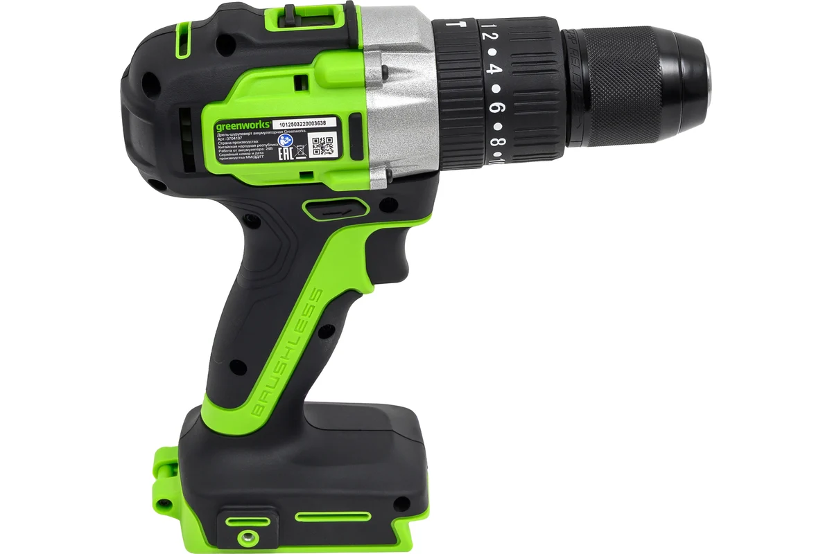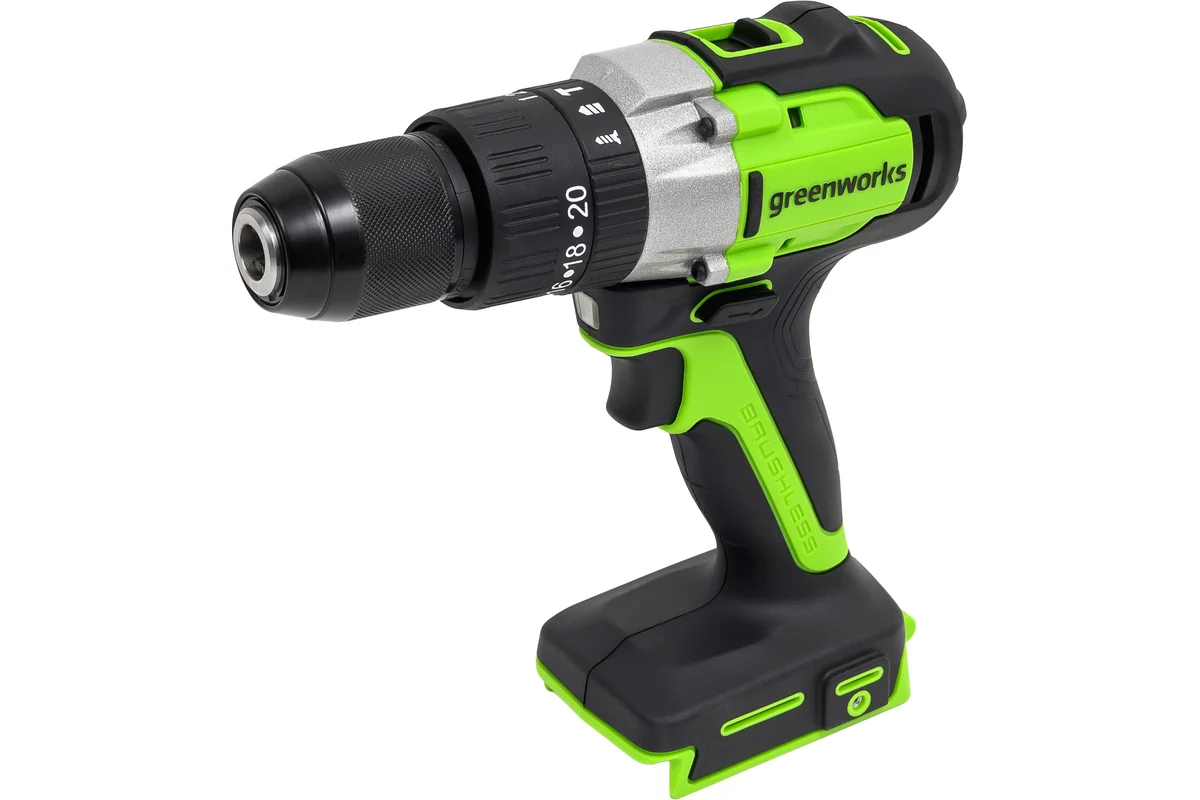 Компактная ударная дрель-шуруповерт Greenworks 3704107 (GD24DD60), с тремя рабочими режимами для работ в мастерской или на стройплощадке: сверление с ударом (ударная дрель), сверление без удара и заворачивание/отворачивание метизов.