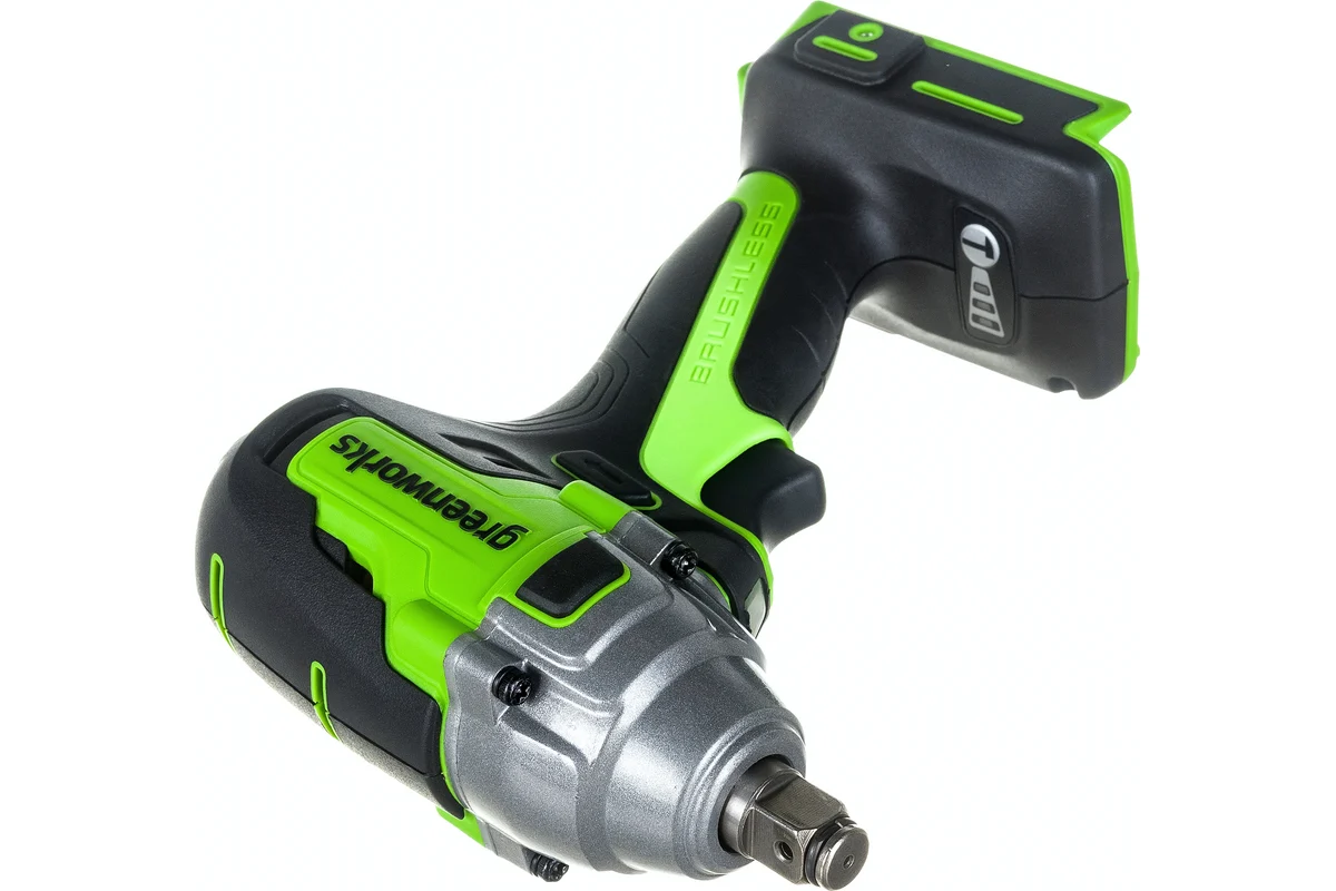 Ударный гайковерт Greenworks 3802907 (G24IW400) – мощный инструмент для работ с резьбовым крепежом (гайки, болты) и метизами (винты, саморезы, шурупы) в гараже, в мастерской или на строительной площадке.