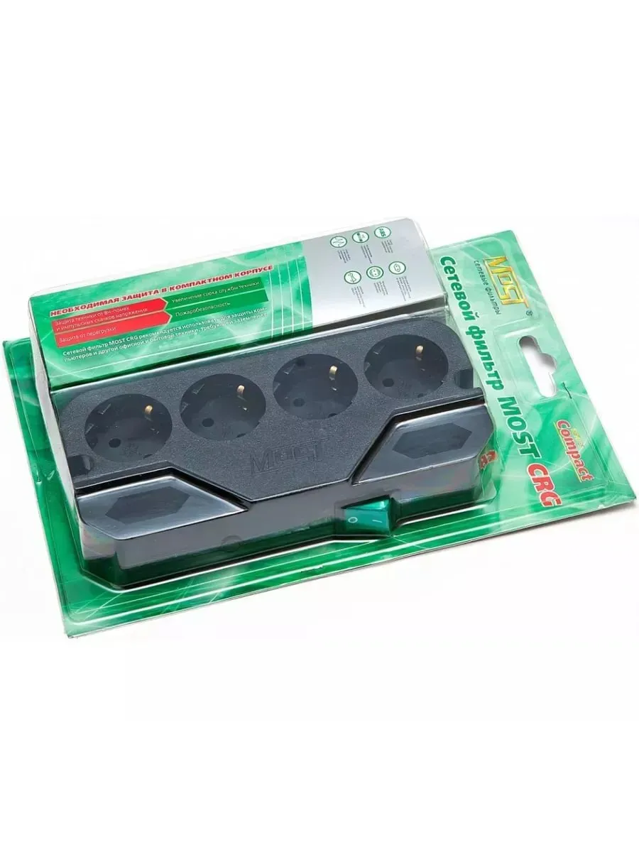 Most СRG это компактный сетевой фильтр. Его размер всего 19,5 см в длину и он легко размещается на мужской ладони. При этом 4 евророзетки на ток 10А и 2 узких розетки на ток 2,5А достаточны для подключения многих устройств. Сетевой удлинитель имеет выключатель с подсветкой и термобиметаллический предохранитель защищающий фильтр от перегрузки. Сетевой фильтр предназначен для защиты техники от импульсных и высокочастотных помех. Длина шнура 2 или 5 метров. CRG имеет отличные технические характеристики, а также содержит шнуроукладчик с обратной стороны. Поэтому, при креплении на стену шнур можно вывести в любую сторону (вправо, влево или даже по центру). А сквозные отверстия для закрепления фильтра делают это занятие быстрым.