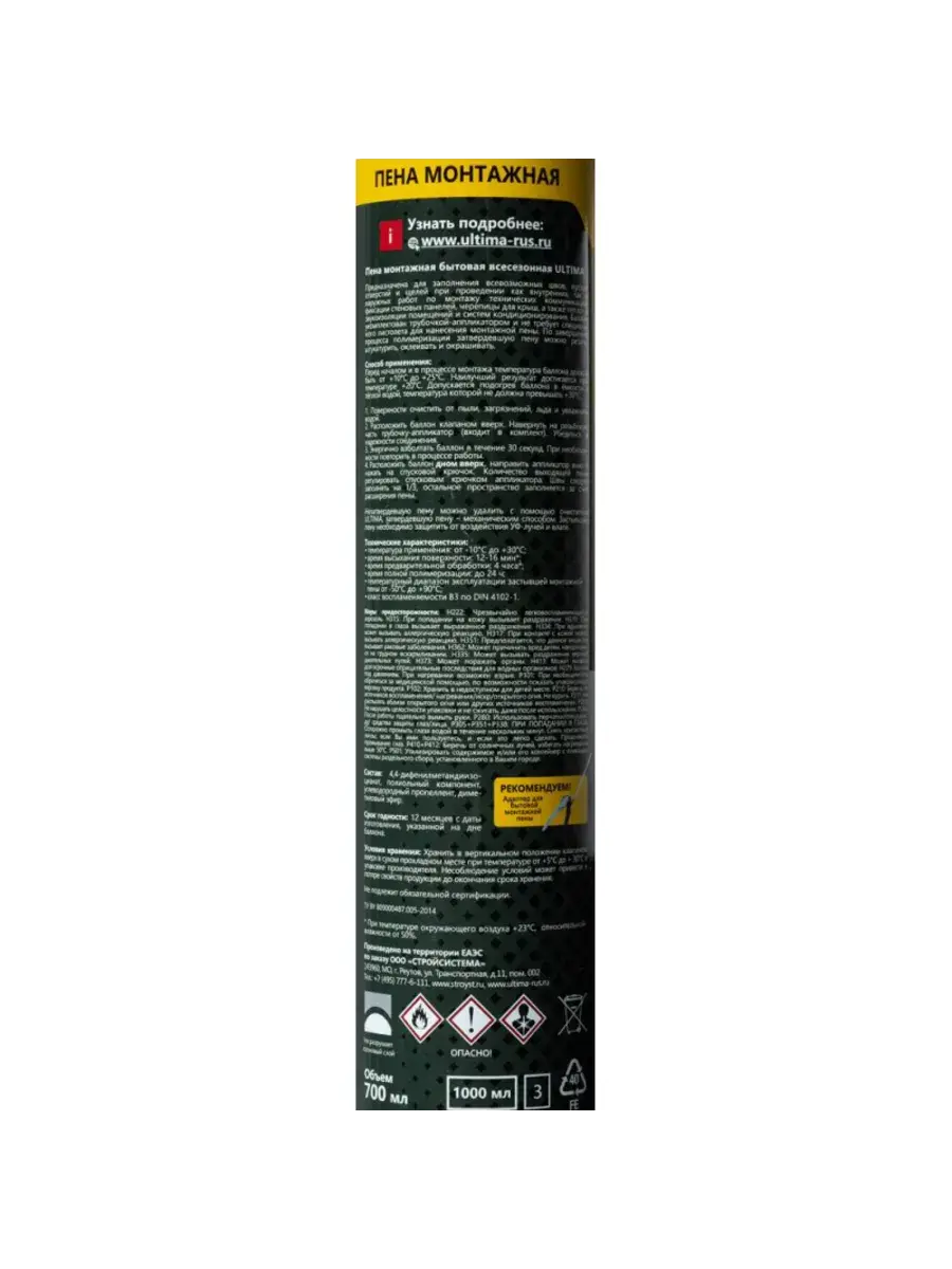 Монтажная пена Ultima объёмом 700 мл идеально подходит для выполнения различных задач как внутри, так и снаружи помещений. Удобный аппликатор в комплекте упрощает процесс работы, не требуя использования монтажного пистолета. Пена отличается отличной адгезией к большинству строительных материалов и обеспечивает быструю полимеризацию. Благодаря высокой заполняющей способности, она эффективно фиксирует изоляционные и утеплительные материалы на стенах, а также заполняет щели и пустоты. Ultima также обладает тепло- и звукоизоляционными свойствами, что делает её идеальным решением для монтажа технических коммуникаций. Всесезонная формула позволяет использовать продукт в температурном диапазоне от -10 до +30 градусов, а выход материала достигает 45 литров с возможностью вторичного расширения до 70.