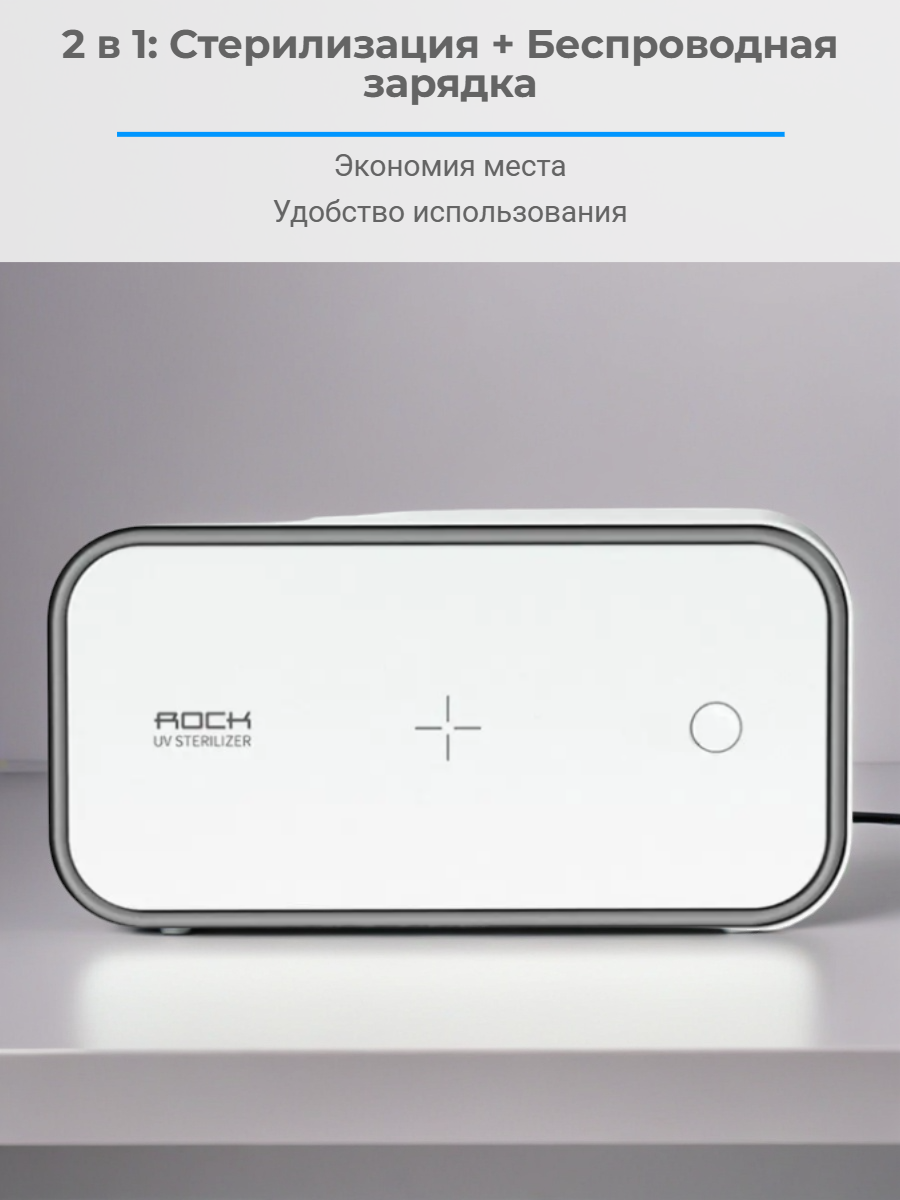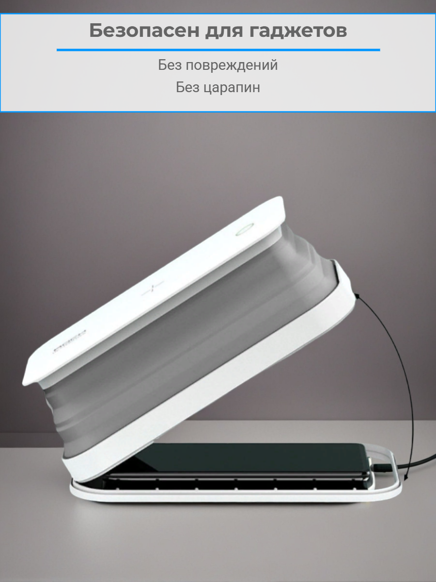 Мощность УФ лампы: 12 мВт Длина волны: 260 - 280nm Дополнительные функции: встроенная беспроводная зарядка Выход беспроводной зарядки: 15 Вт Мощность (макс): 18 Вт Габариты: 200 х 103 х 20.5 мм Питание: сетевой адаптер Вход: 5В/2А, 9В/2А Артикул производителя: 6941402731854 Вес с упаковкой: 345 г Материал: поликарбонат, силикон.
