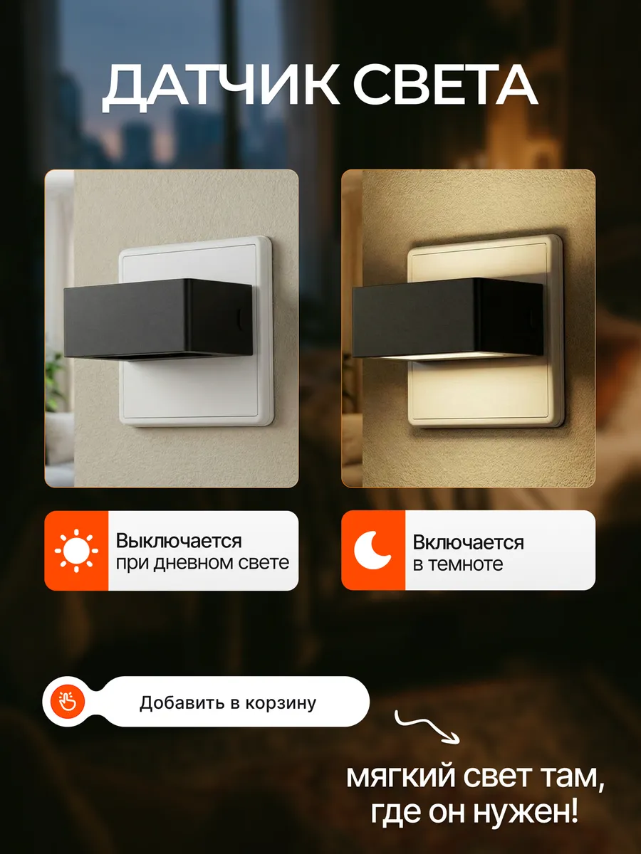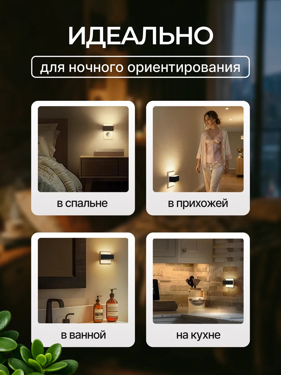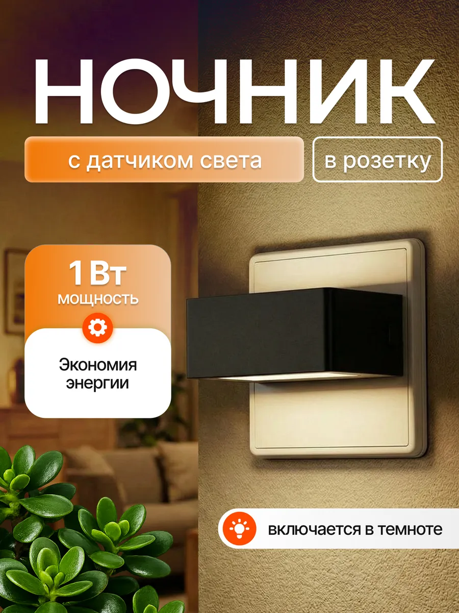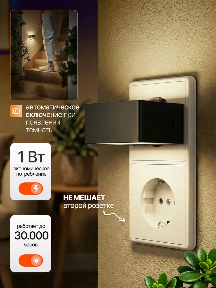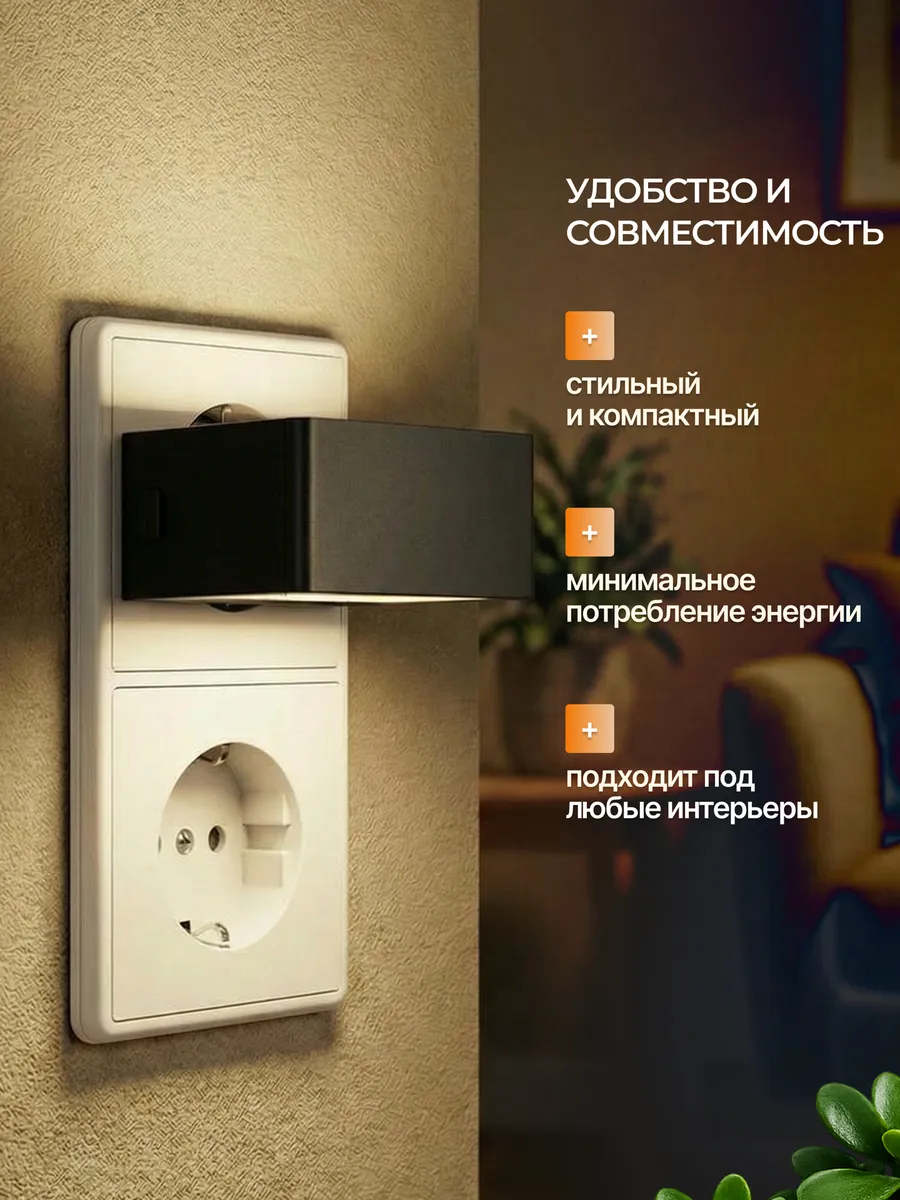 Преимущества и функциональность ночника в розетку : • Оснащён Светодиодными лампами с двухсторонним освещением, создавая мягкий и равномерный свет. • Имеет выключатель с регулятором яркости— 3 уровня освещённости. Для выключения достаточно удерживать кнопку 2 секунды. • Работать от сети, не требует батареек или дополнительных источников питания. • Есть датчик света, который автоматически включает ночник в тёмное время суток. • Ночной светильник подходит для установки в спальне, детской, ванной, кухне, прихожей, на лестнице, в кладовой, гардеробной, на лоджии и в шкафу. Комфорт для всей семьи: • Мягкий свет не слепит глаза, создавая уютную атмосферу для отдыха и сна. • Для детей — дополнительная функция белого шума помогает малышу спокойно засыпать. Стиль и практичность: • Компактный размер и современный дизайн делают ночник стильным акцентом в интерьере. • Универсальное освещение подходит для любых комнат.