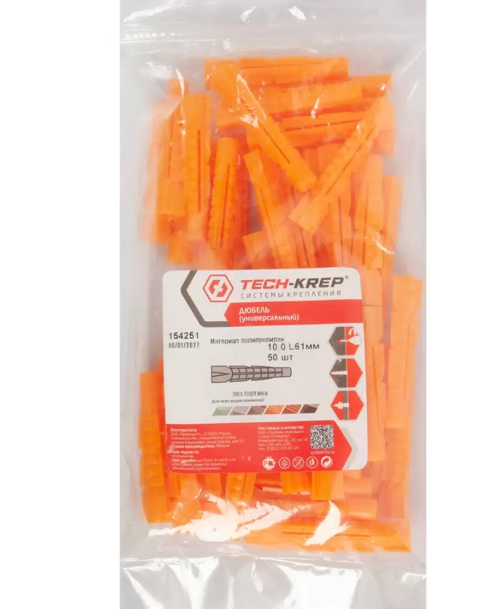 Технические характеристики дюбеля Tech-Krep 10x61 мм, без бортика
