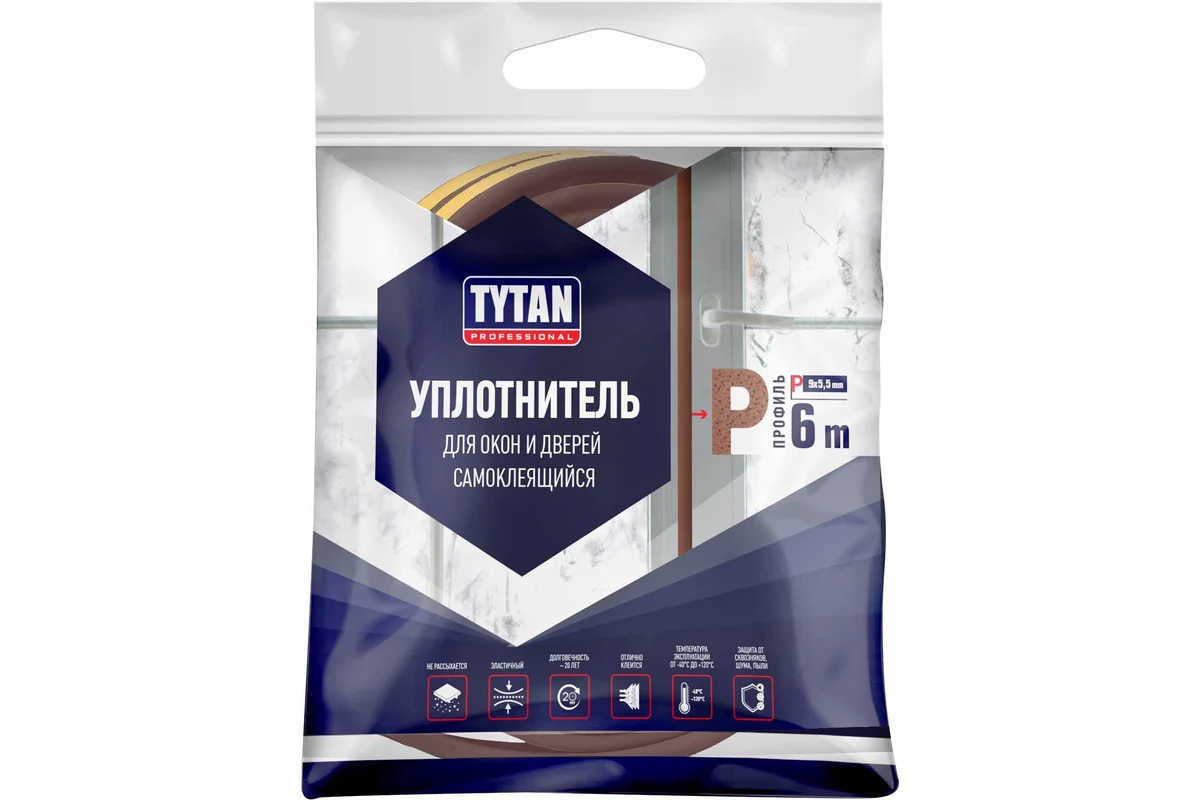 Уплотнитель для окон и дверей Tytan Professional p 6 м, 9x5.5 мм, коричневый 260671