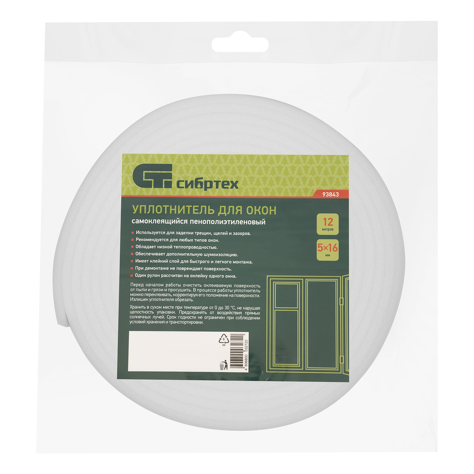 Самоклеящийся уплотнитель для окон Сибртех 93843 размером 5 мм х 16 мм х 12 м обеспечивает тепло- и шумоизоляцию, предотвращает образование сквозняков, попадание пыли. Может использоваться в жилых, производственных и иных помещениях.