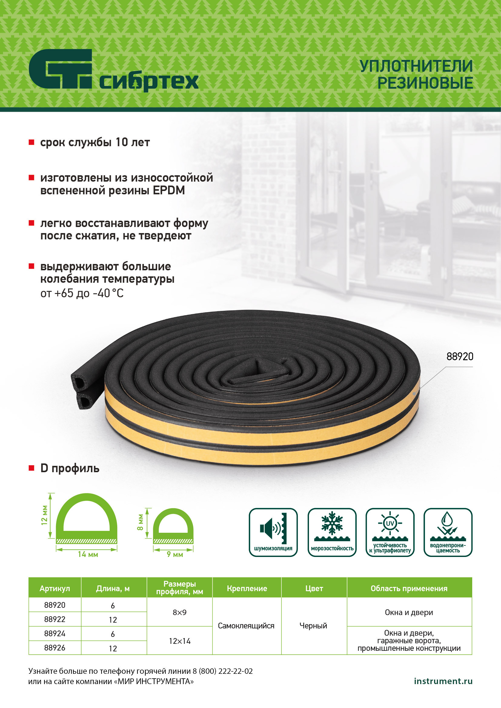 Резиновый уплотнитель Сибртех 88922 черного цвета, длиной 12 м, с профилем «D», обеспечивает надежную защиту от шума, влаги и пыли, помогает сохранить тепло в помещении. Предназначен для уплотнения окон и дверей, оптимален для щелей шириной 3-7 мм.