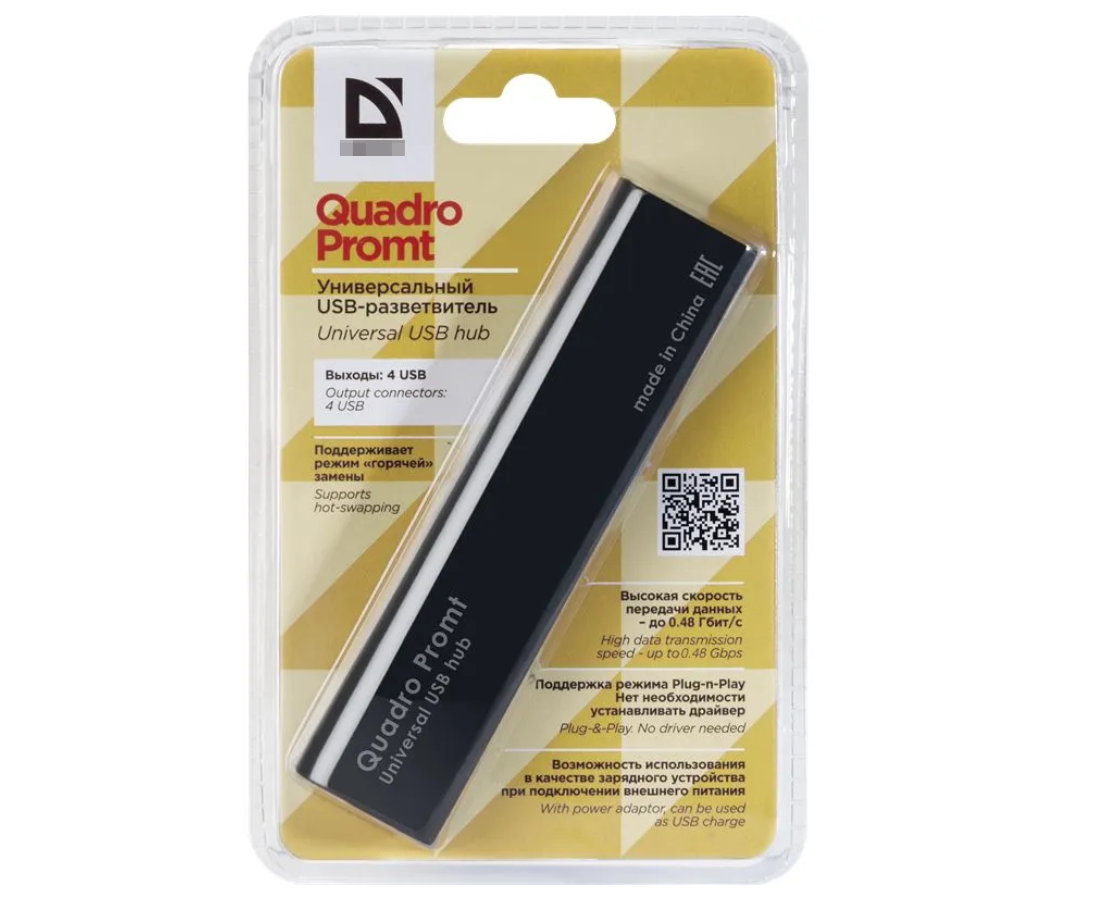 USB разветвитель Quadro Promt USB 2.0, 4 портаUSB-разветвитель Quadro Promt USB 2.0 – универсальная четырехпортовая модель, не требующая для своей работы установки дополнительных драйверов. При подключении компьютер сразу определяет устройство как хаб, после чего можно использовать его для подсоединения различной компьютерной периферии. Облаченный в черный корпус разветвитель имеет светодиодный индикатор работы для удобства использования. Дополнительному комфорту способствует возможность отсоединения кабеля подключения длиной 82 см. USB-разветвитель Quadro Promt USB 2.0 для безопасного подключения к нему различных устройств поддерживает токовую защиту своих портов. Четыре интерфейса USB 2.0 обеспечивают скорость передачи данных до 480 Мбит/сек., чего достаточно для быстрого обмена информацией и стабильной работы периферии.