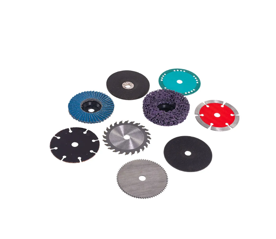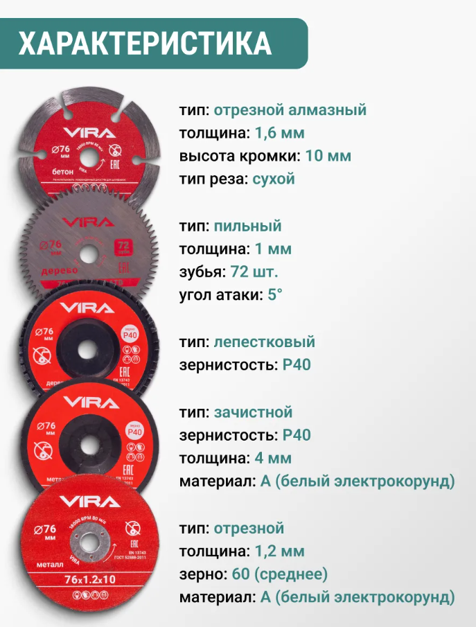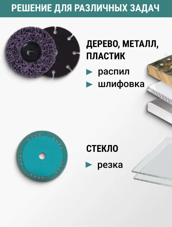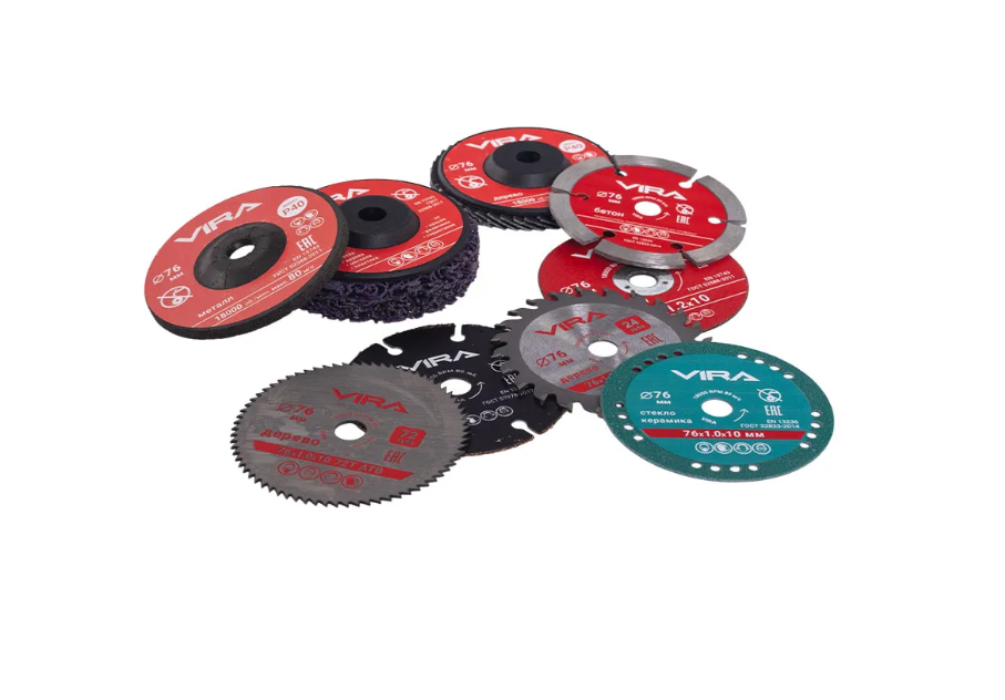 Диск алмазный сегментированный; Диск пильный по дереву HSS; Диск пильный по дереву ATB; Диск отрезной по металлу; Диск лепестковый зачистной абразивный по дереву; Диск зачистной по металлу; Диск отрезной по стеклу; Диск зачистной полимерный; Диск отрезной универсальный