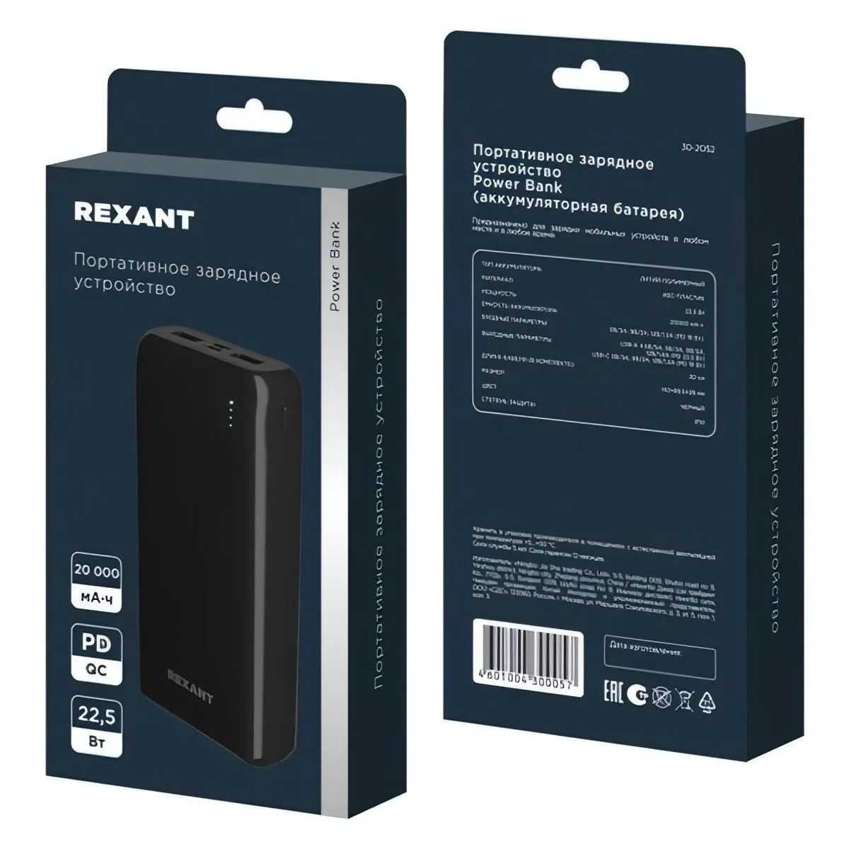 Внешний аккумулятор Rexant 20000mAh QC, PD 30-2052 с типом батареи Li-Polymer заряжается за четыре часа.