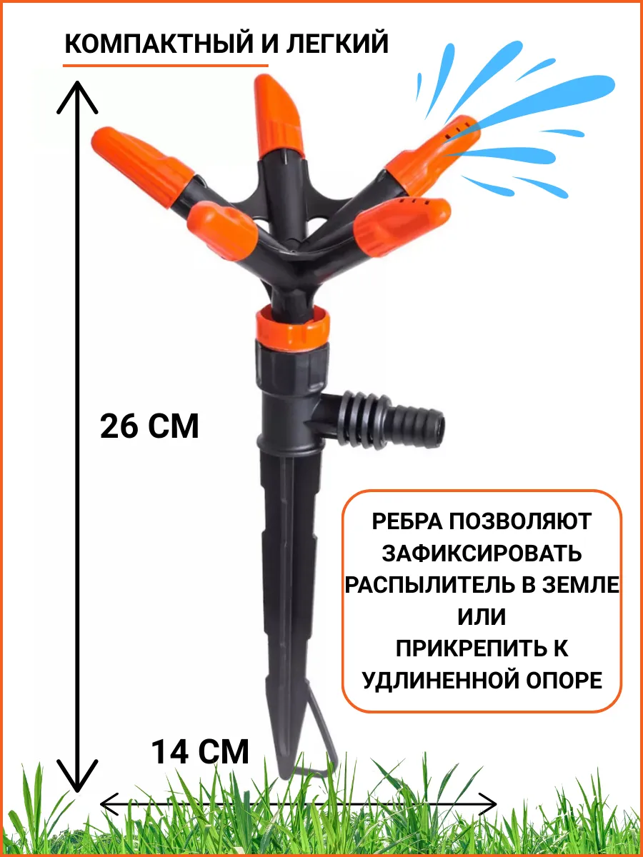 Вращающийся разбрызгиватель дождеватель - это автоматический уличный садовый автополив альтернатива лейки который равномерно орошает грядки посевы газоны и другие зеленые участки. Распылитель оснащен соплами которые создают несколько перекрывающихся струй для тщательного покрытия всей площади. Поливалка веерная крутящаяся с пятью специальными насадками очень удобна в использовании и обеспечивает орошение ваших растений через маленькие форсунки для полива имитируя мини дождь. Вертушка для сада это то что вам нужно теченнии всего дачного сезона. Распрыскиватель подключается к шлангу или насосу и устанавливается на грунт при помощи колышка, который входит в комплект.