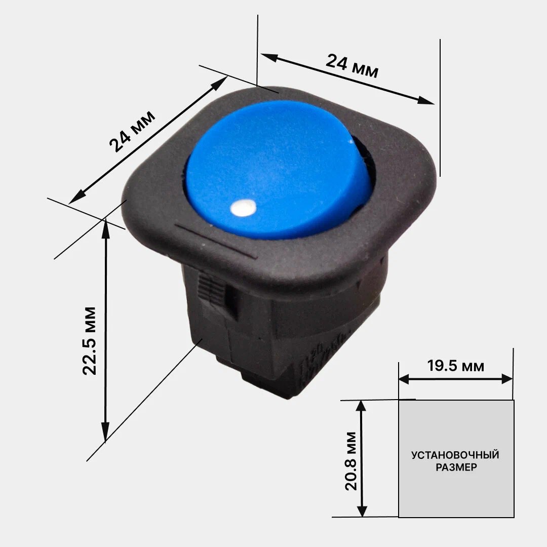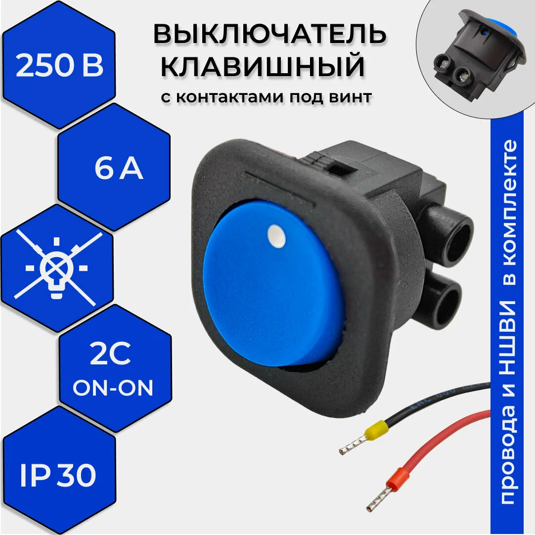 Выключатель клавишный круглый 250V 6А (2с) под винт ON-OFF синий – это надежное и функциональное коммутационное устройство, предназначенное для использования в промышленной и бытовой электронной аппаратуре.