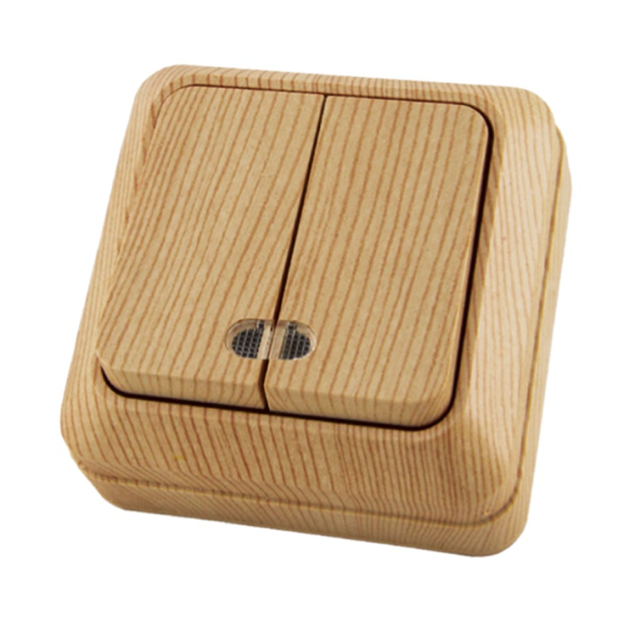 Выключатель двухклавишный с индикацией открытой установки, цвет светлое дерево (сосна). Корпус из самозатухающего ABS-пластика, обеспечивающего прочность и устойчивость к воздействию солнечных лучей. Металлокерамические контакты позволяют сочетать высокую дугостойкость с хорошей проводимостью.