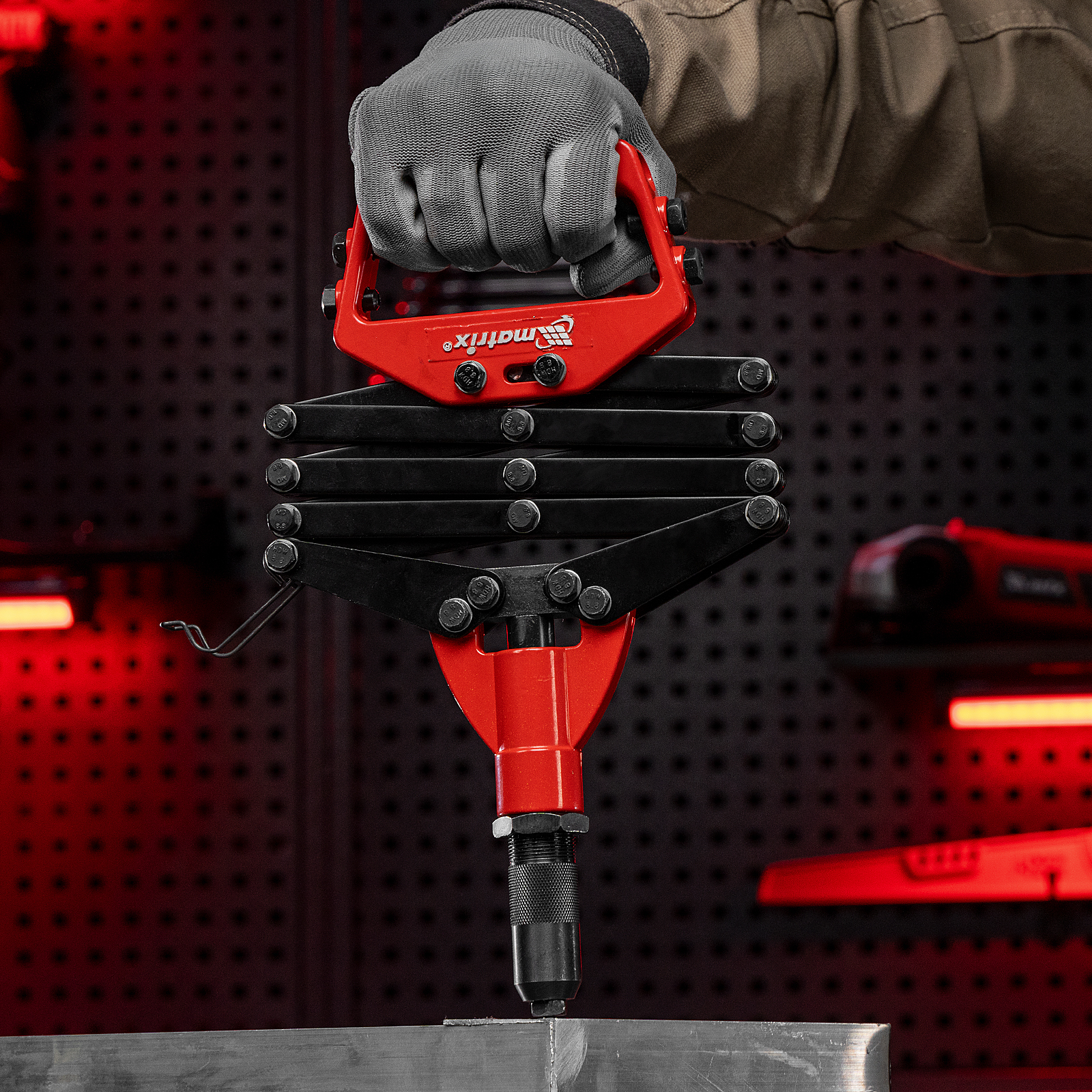 Усиленный заклепочник Matrix «Гармошка» 405505 длиной 800 мм позволяет соединять металлические листы и профили при помощи вытяжных заклепок диаметром 3,2-4,0-4,8-6,0-6,4 мм. В комплект поставки входят сменные головки соответствующих размеров. Прижимной механизм в виде пантографа экономит усилия, облегчая интенсивную работу. Инструмент используется в строительстве, на производстве и в ремонтных мастерских, а также пригодится в быту.
