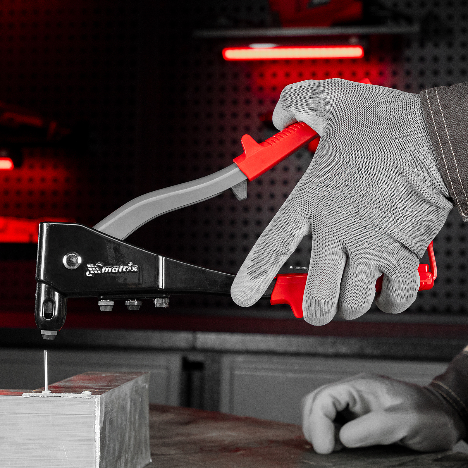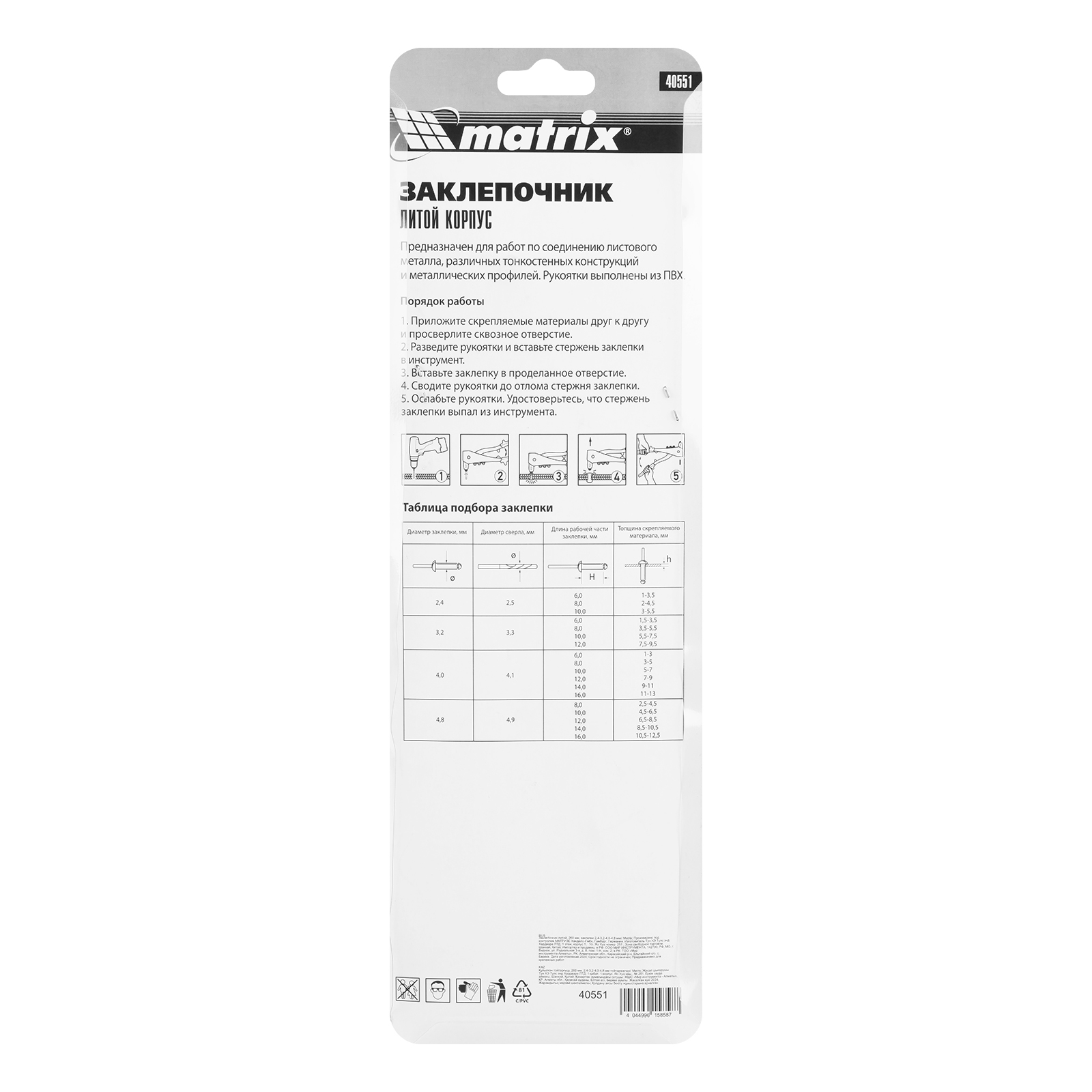 Литой заклепочник Matrix 40551 длиной 260 мм формирует прочные неразъемные соединения металлических листов и профилей. Используется с заклепками диаметром 2,4-3,2-4,0-4,8 мм, для которых предусмотрены сменные насадки соответствующих размеров. Инструмент применяется в строительстве, во время ремонта, сборки мебели и техники, а также полезен в быту.