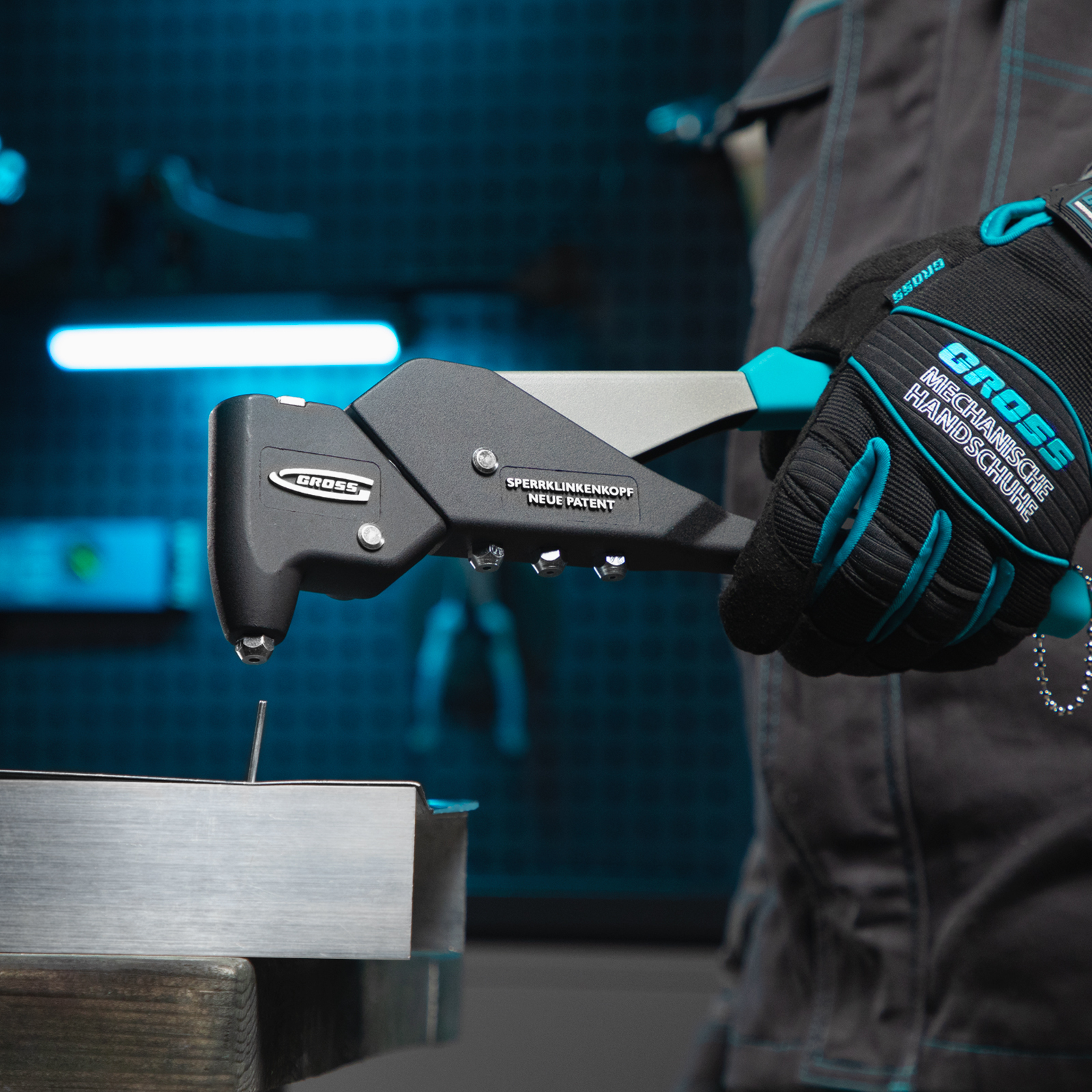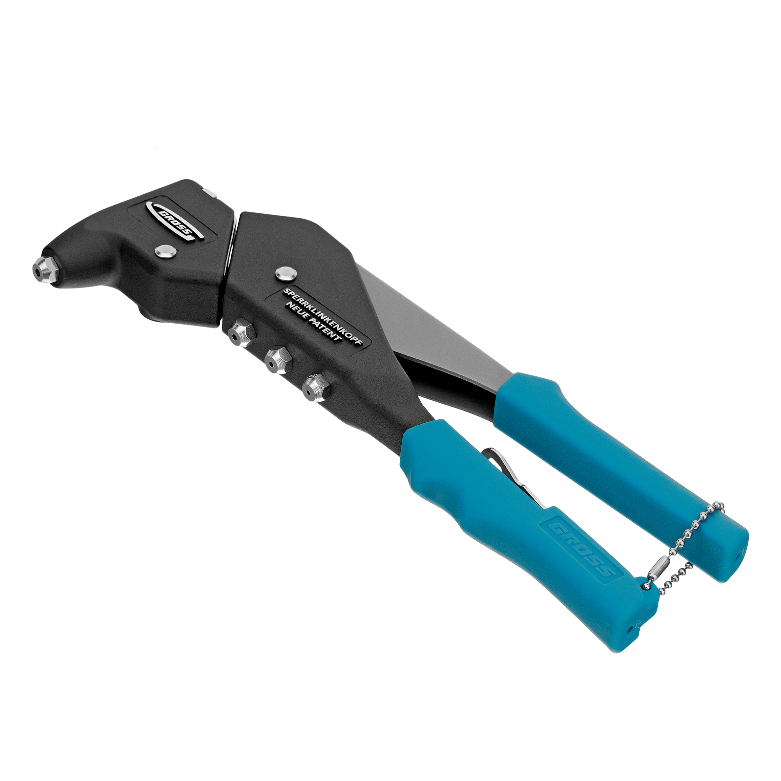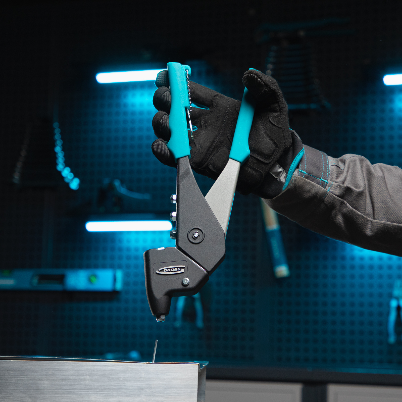 Литой усиленный заклёпочник Gross 40405, поворотный 0-360 градусов, применяется для соединения листовых заготовок, легких строительных конструкций и металлопрофиля. Инструмент совместим с заклёпками — стальными 2,4-3,2 мм, нержавеющими 2,4 мм и алюминиевыми 2,4-4,8 мм. Для всех размеров крепежей имеются соответствующие головки. Рабочая часть вращается на 360 градусов, поэтому инструмент оптимально подходит для работы в труднодоступных местах. Заклёпочник используется в профессиональной сфере — для строительства и ремонта, а также производства оборудования и мебели.