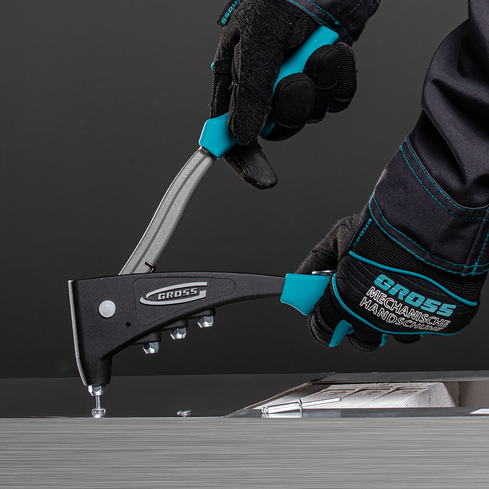 Литой усиленный заклепочник Gross 40403 для заклепок диаметром 2,4-4,8 мм применяется для надежного соединения плоских заготовок и деталей. Для этого используются стальные и алюминиевые заклепки или заклепки из нержавеющей стали. Для установки крепежа не требуется особых усилий благодаря кованому изогнутому рычагу. Инструмент используется в строительстве, при производстве мебели и техники, для соединения листового металла и т.д.