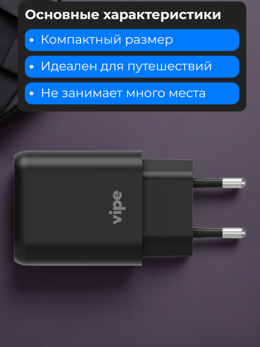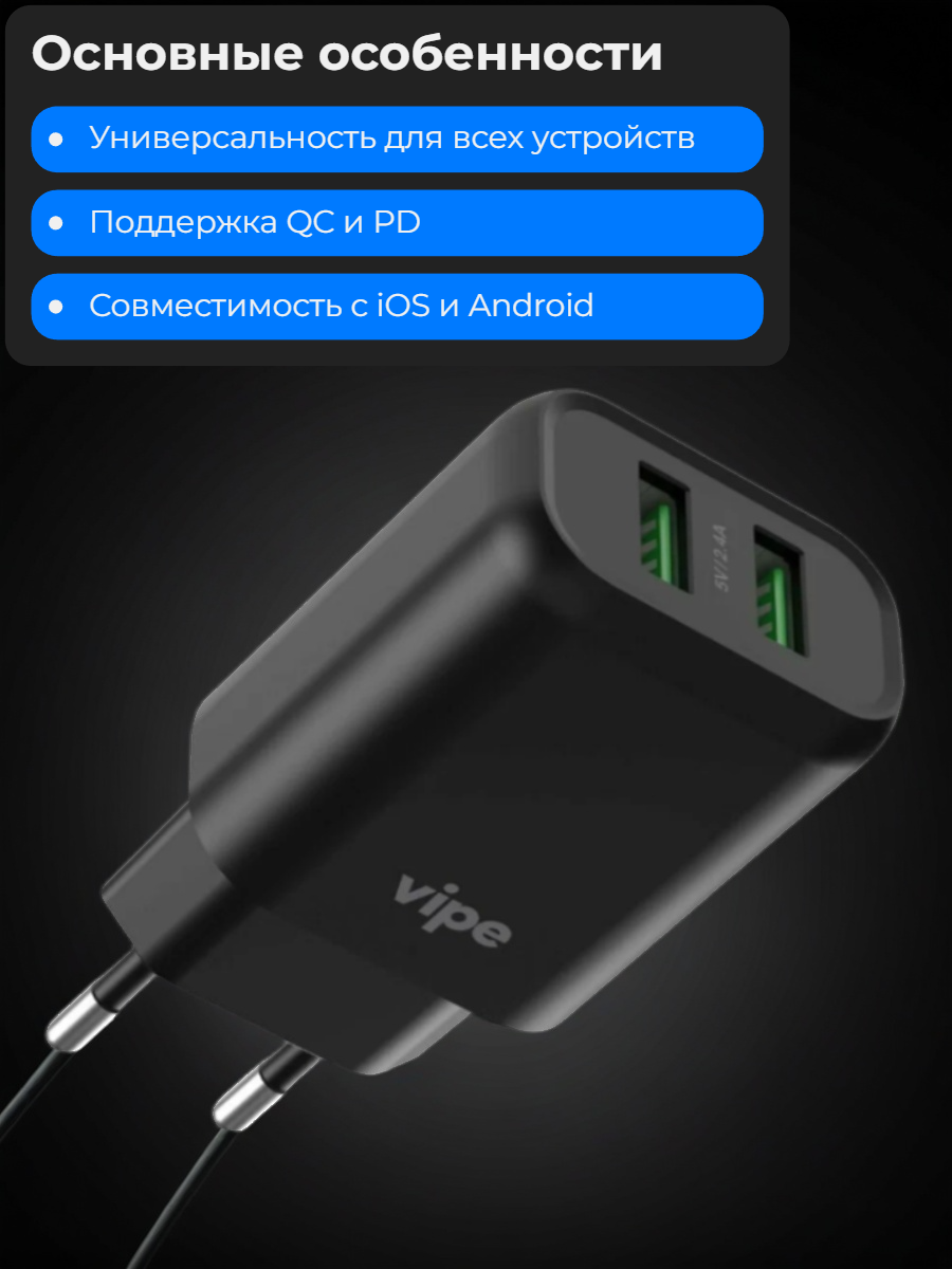 Сетевое зарядное устройство Vipe 12W это стильное, компактное устройство, которое позволит зарядить фактически любой ваш мобильный гаджет. Зарядное устройство оснащено двумя разъемами USB А. Компактный и эргономичный корпус выполнен из качественного ABS-пластика, что наделяет устройство прочностью, термостойкостью, устойчивостью к царапинам и мелким повреждениям. Сетевое зарядное устройство Vipe - незаменимая вещь для удобной и безопасной зарядки Ваших гаджетов. Внешний вид и/или характеристики товара могут быть изменены производителем в соответствии с производственным процессом.