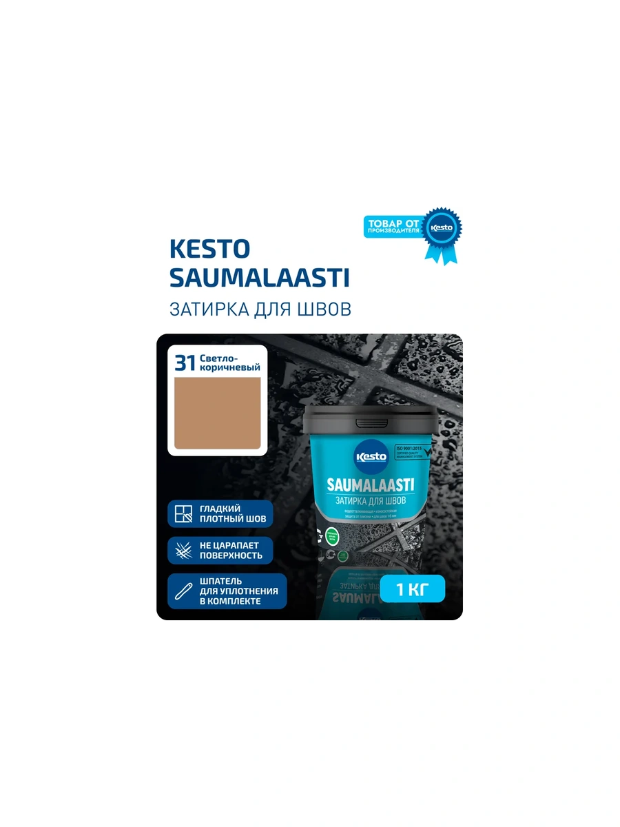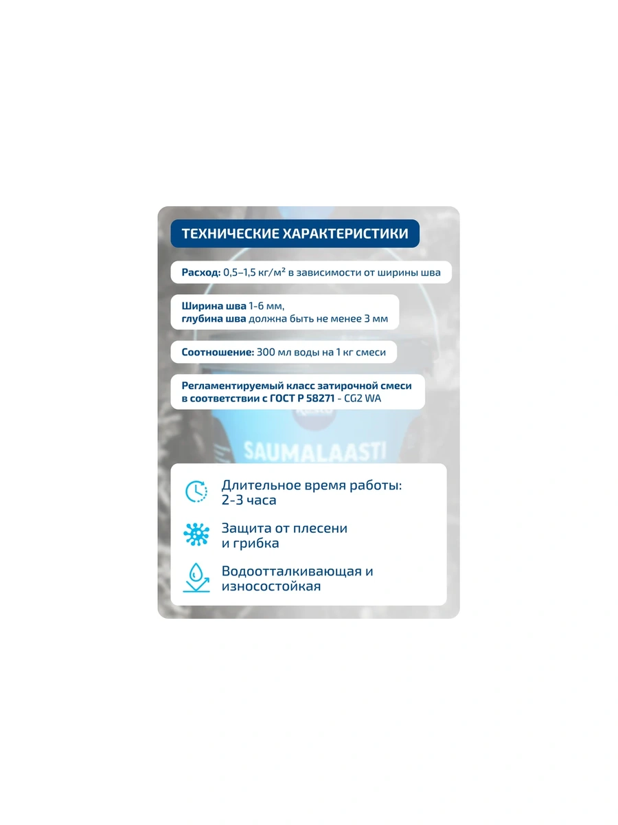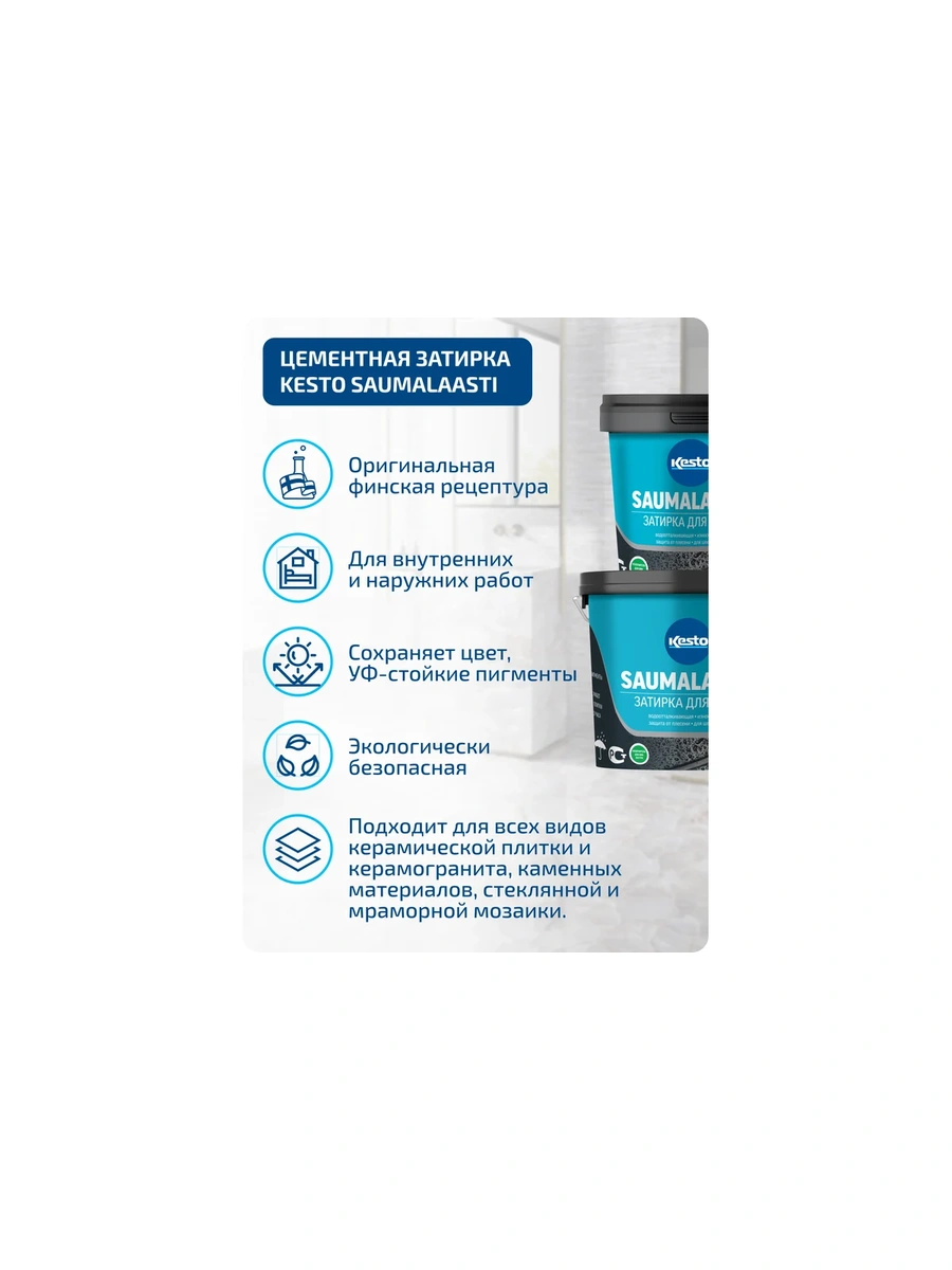 Kesto Saumalaasti — затирка c cверхнизким выделением вредных летучих веществ для заделки швов между кафельными и клинкерными плитками, а также между другими керамическими материалами. Ширина шва 1-6 мм. Глубина шва должна быть не менее 3 мм. Раствор подходит для заполнения швов на полах и стенах внутри и снаружи помещений.