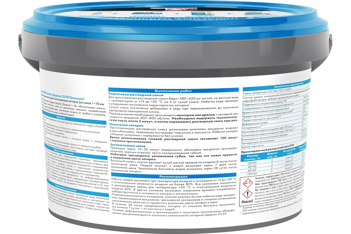 Затирка CE 40 предназначена для заполнения швов облицовок из керамических, каменных (в том числе мраморных) и стеклянных (кроме зеркальных) плиток на полах и стенах внутри и снаружи зданий, при ширине шва до 10 мм.