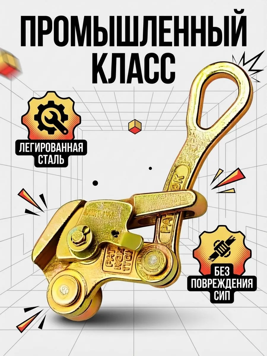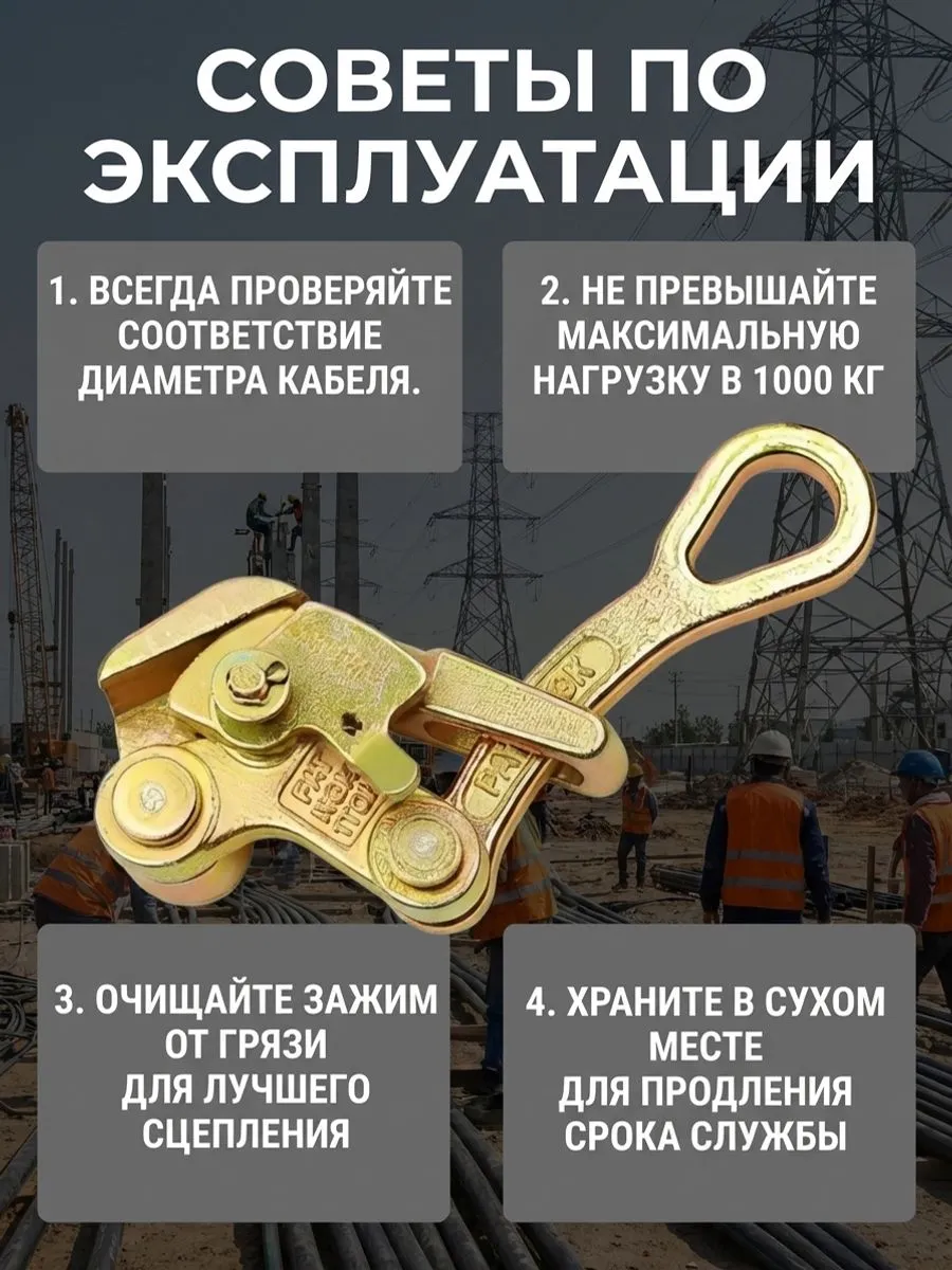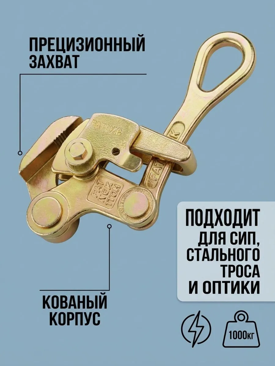 Для регулировки провеса и придания кабелю конечного тяжения при проводке воздушных линий электропередач используется зажим монтажный Лягушка. Может применяться для регулировки стрелы провеса кабельной линии при монтаже проводов, для монтажа как изолированных (с применением провода СИП), так и неизолированных ВЛ, подходит также для захвата стального троса, каната, провода АС или грозотроса диаметром от 2,5 до 16 мм. Инструмент для качественного монтажа СИП позволяет предотвратить образование петель и раскручивания СИП при раскатке, обеспечить натяжение и отрегулировать стрелу провеса СИП, отрегулировать натяжение проводов и обеспечить перестановку провода СИП с монтажного ролика на поддерживающие и анкерные зажимы, провести монтаж стальной ленты, отделить жилу от общего пучка проводов. Зажим монтажный выдерживает нагрузку до 1 тонны. Он изготовлен из прочной легированной стали, прост в применении, долговечен в использовании, легко устанавливается и снимается. Тяговый инструмент при работе не повреждает изоляцию провода. Допускается работа с оптоволоконным кабелем.